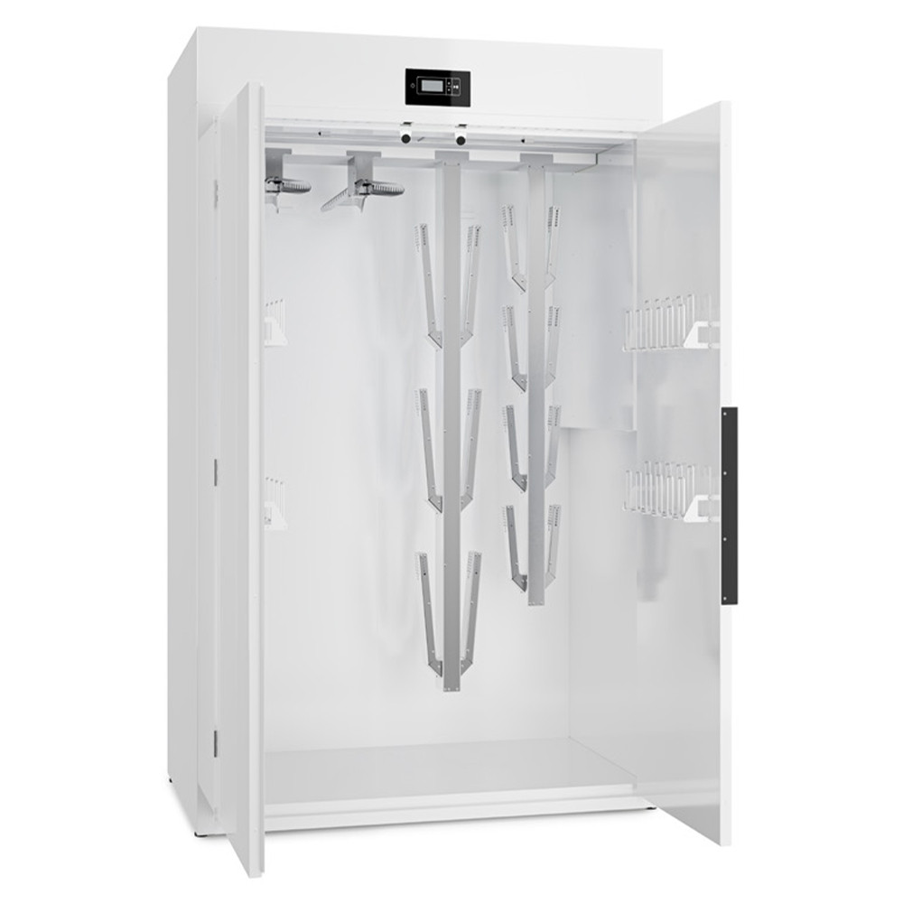 Die robuste Konstruktion aus verzinktem, pulverbeschichtetem Stahl bietet zuverlässigen Schutz vor Korrosion und sorgt für eine lange Lebensdauer auch unter anspruchsvollen Einsatzbedingungen. Der Schrank wird standardmässig mit 4 abnehmbaren, belüfteten Kleiderbügeln geliefert. Diese sorgen für eine gleichmässige Durchströmung der Kleidung von innen nach aussen, selbst bei dicken und mehrlagigen Kleidungsstücken. Auf Anfrage sind Halterungen zur Innentrocknung von Stiefeln sowie Trocknungsdüsen von Handschuhen oder Masken erhältlich. Zusätzlich kann die Ausstattung auf Anfrage mit Handschuhhaltern an den Türinnenseiten ergänzt werden.
