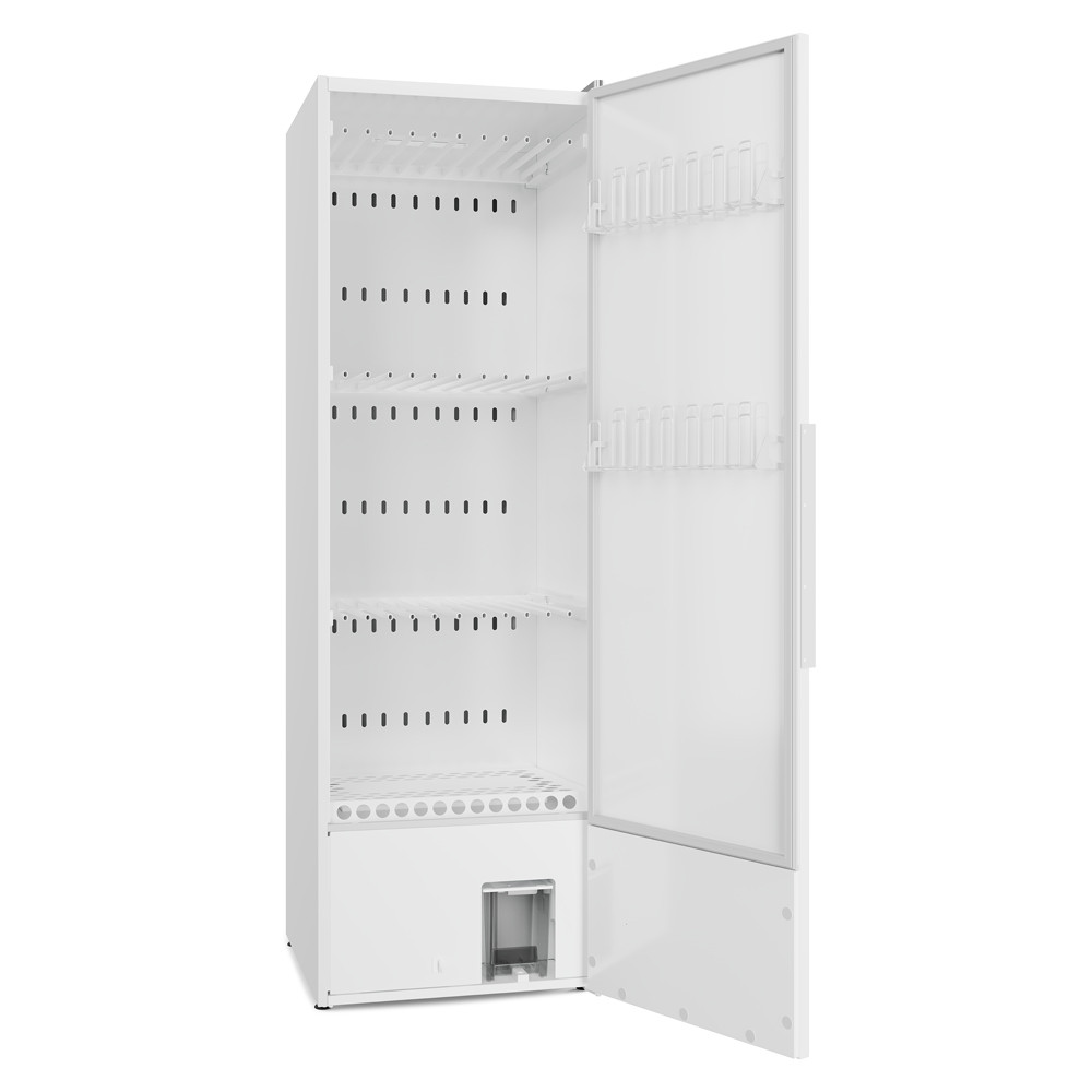 L'armoire de séchage est robuste, durable et résistante à la corrosion grâce à son acier galvanisé. Grâce à sa largeur compacte de seulement 60 cm, elle s'intègre également dans les petites pièces. Elle ne nécessite pratiquement aucun entretien, seuls le bac à eau et le filtre à air doivent être vidés régulièrement. L'armoire de séchage est équipée en série d'une charnière de porte montée à droite. Pour les cas particuliers, un kit de conversion est disponible sur demande moyennant un supplément. Il permet de déplacer la charnière de porte à gauche (conversion à effectuer par le client).
