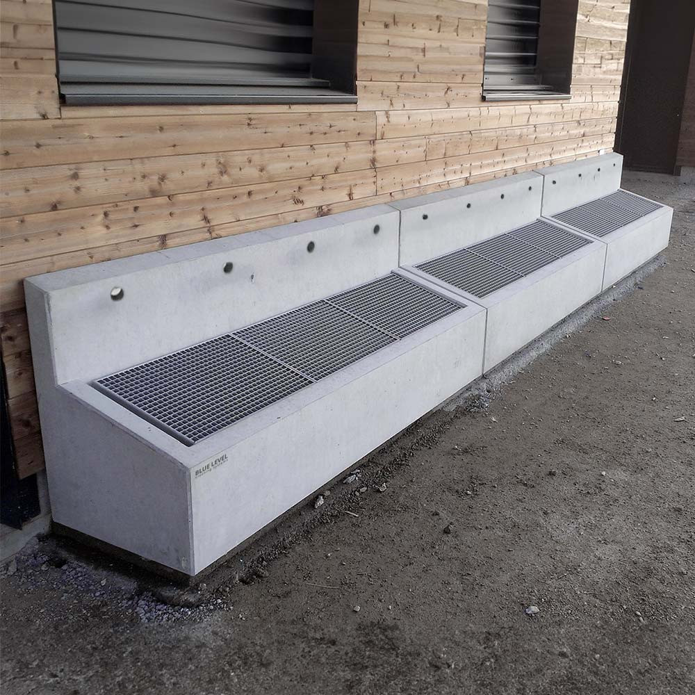 Le lave-chaussures et lave-bottes résistant au gel est en béton lisse et robuste avec des bords chanfreinés et convainc par sa grande longévité. Une paroi arrière intégrée en béton empêche les projections d'eau et protège les façades adjacentes, ce qui est idéal pour une installation peu encombrante directement contre les bâtiments. Les caillebotis amovibles en acier galvanisé sont solides et faciles à nettoyer.