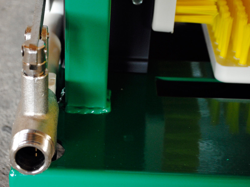 La version standard est fabriquée en acier soudé, peint par poudrage. Si cet appareil entre en contact avec des produits acides ou similaires ou qu’il est régulièrement exposé à une humidité élevée, la version en acier inoxydable est idéale. Celle-ci peut être sélectionnée sous « Options ». Grâce à la brosse à main disponible séparément, même les endroits difficiles d'accès et autres équipements tels que des tabliers ou des caisses peuvent être nettoyés rapidement et soigneusement (voir accessoires ci-dessous).