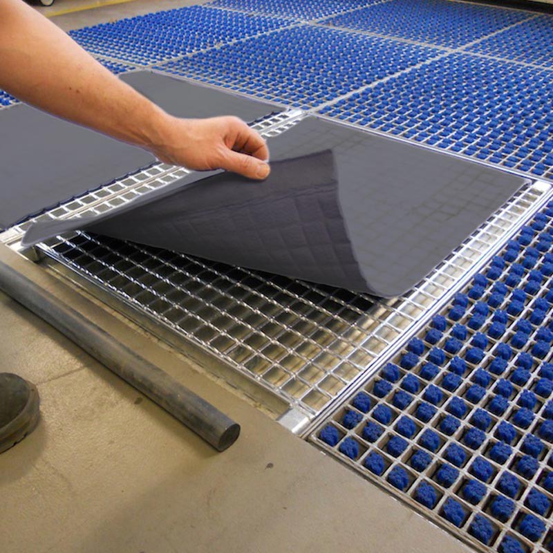 Pour un séchage efficace des semelles de chaussure, le DryPad est tendu sur une grille en acier galvanisé à chaud. Le non-tissé ultra-absorbant est fixé à la grille à l'aide de rouleaux de serrage en caoutchouc ; une procédure rapide et sans dangers. En marchant sur la toison, les liquides tels que l'eau, les émulsions, les huiles, etc. sont absorbés et les semelles des chaussures de travail, bottes et autres chaussures sont parfaitement séchées. La grille est fixée sur un bac en acier inoxydable de la plus haute qualité. Cette version de ProfilGate est conçue pour une installation en surface. Les rampes en tôle galvanisée à chaud, qui relient le sol et les tapis de tous les côtés, garantissent la facilité d’accès. On évite ainsi la formation de coins dangereux, ce qui écarte le risque de trébucher.