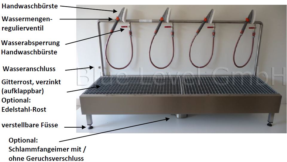 Gegen Aufpreis kann die mitgelieferte Kunststoff-Handwaschbürste durch eine hochwertige Handwaschbürste aus Edelstahl mit Nylonborsten, Handhebelschnellschlussventil und Panzerschlauch aus Drahtgeflecht ersetzt werden (siehe Option Handwaschbürste).